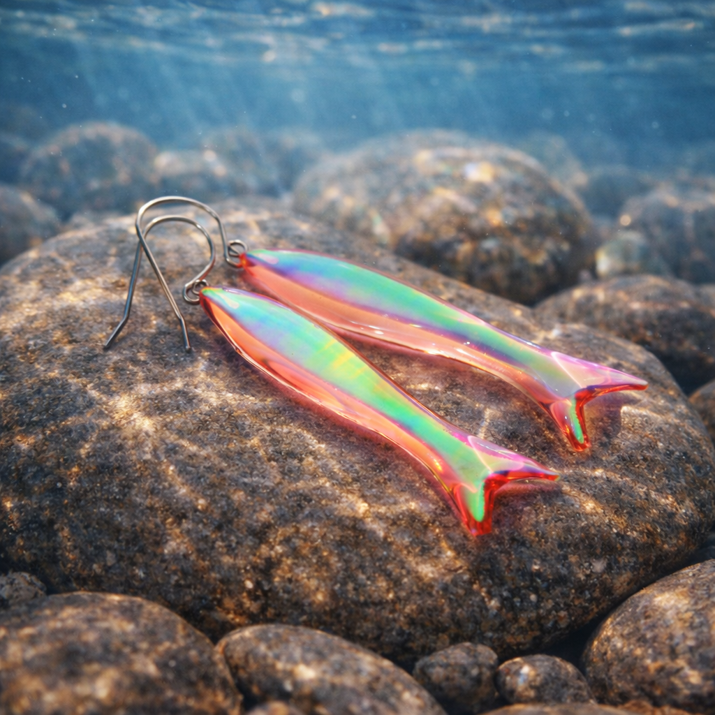 Duhové náušnice jsou vyrobeny unikátní technologií z pryskyřice. Dále jsou přidány barevné irizující materiály, takže naušničky jsou velmi proměnlivé a krásně reagují na světlo. Základní barevnost je růžovozelená. Náušnice mají komponent vždy antialergický (chirurgická ocel). Jedná se o originální ruční výrobu.